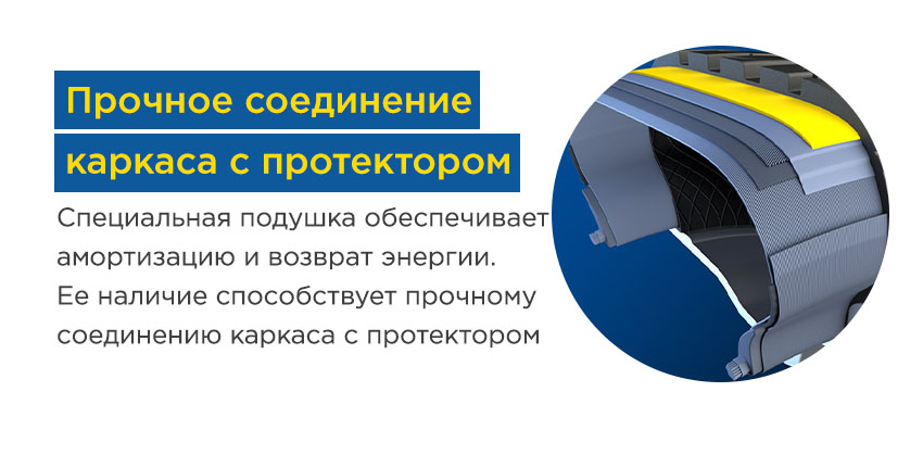 Прочный каркас шины ориентирован не только на оптимизацию работы при совершении перестроений и других, более резких высокоскоростных манёвров, но и на снижение сопротивления качению, и увеличение стойкости шины к износу.