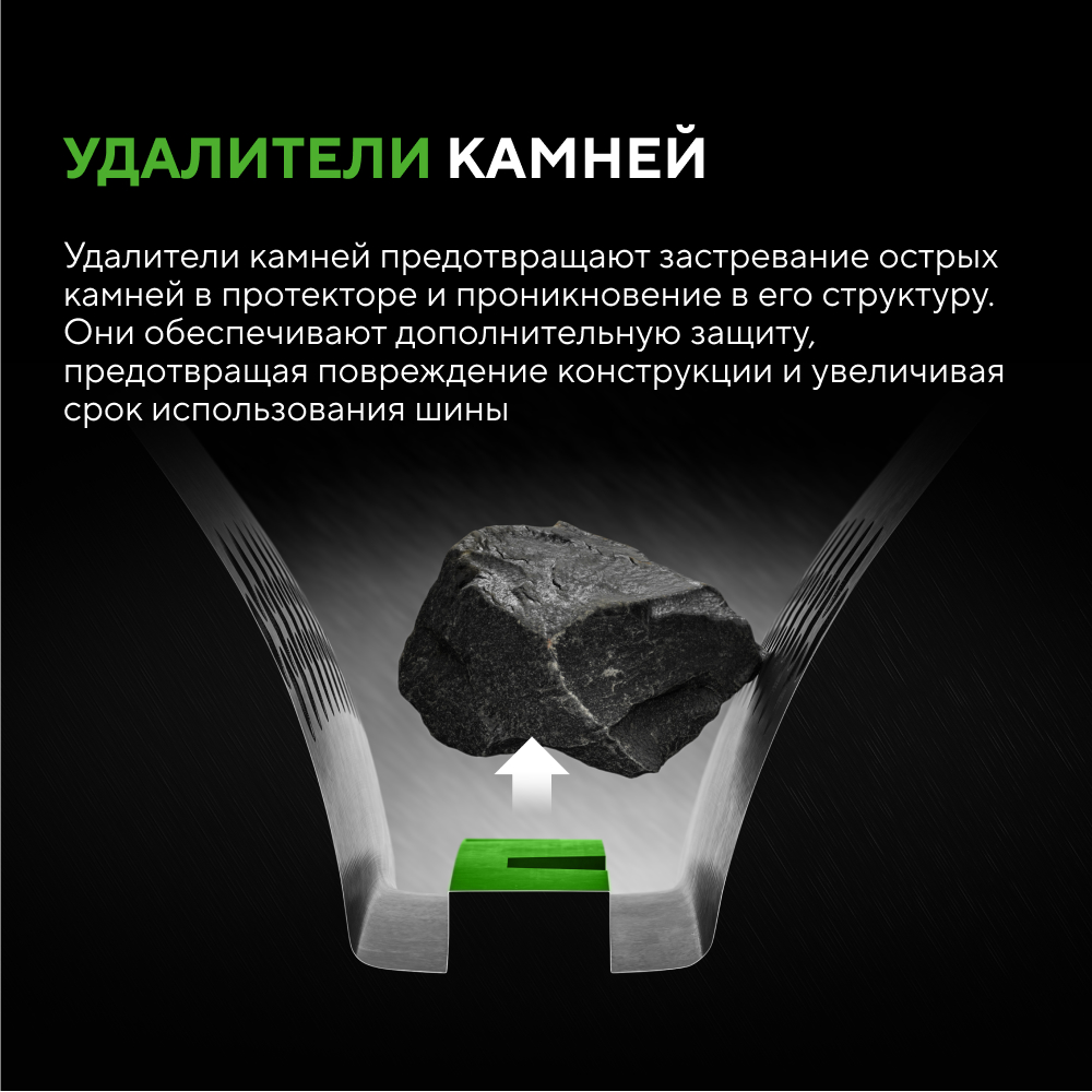 - Специальные удалители камней предотвращают их застревание и повреждение структуры протектора.