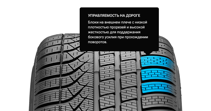 Протекторные блоки на внешнем плече характеризуются низкой плотностью нарезки ламелей и высокой жёсткостью, благодаря чему P Zero Winter, как самые настоящие шины класса Ultra High Performance, могут похвастаться экстремально высокой управляемостью на сухой дороге.