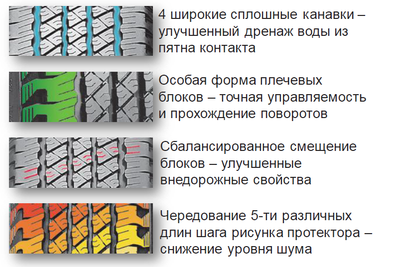 - Четыре широкие продольные канавки быстро отводят воду и дорожную кашу из пятна контакта. Это помогает сохранить сцепление с дорогой и повышает безопасность во время дождя.